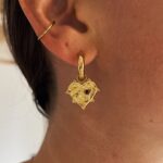 Hoop earrings made up of a heart pendant with a heart motif and a black rhinestone.