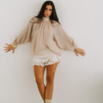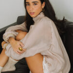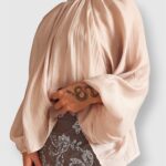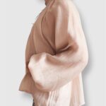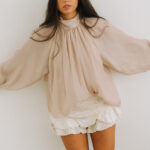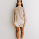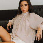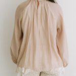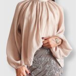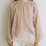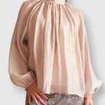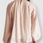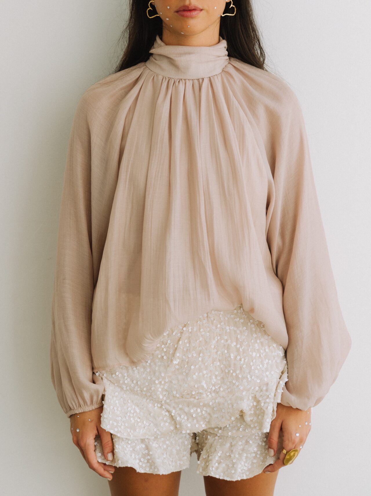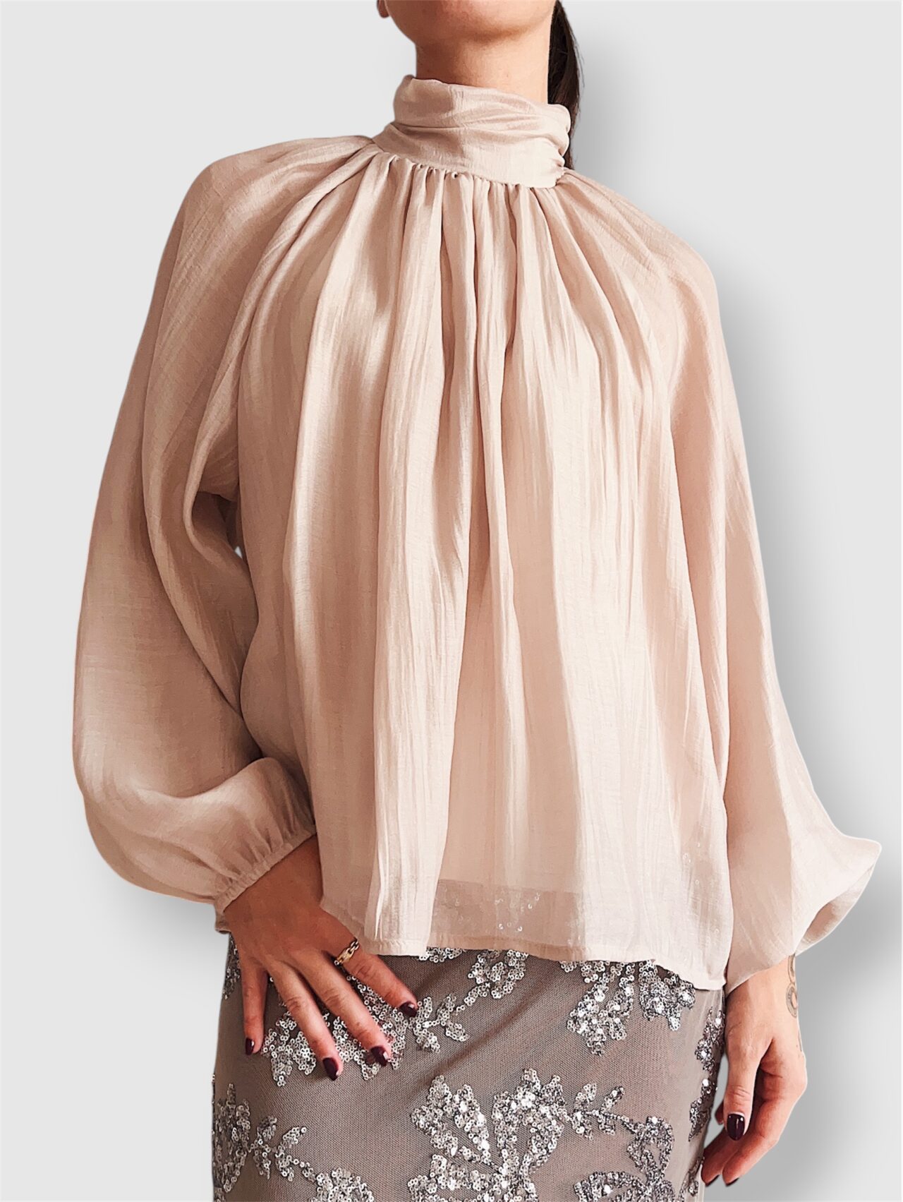 Feminine blouse with long sleeves, a high collar, and an elegant drape. Made from lyocell with a viscose lining, it offers comfort and style. Ideal for a chic everyday look.